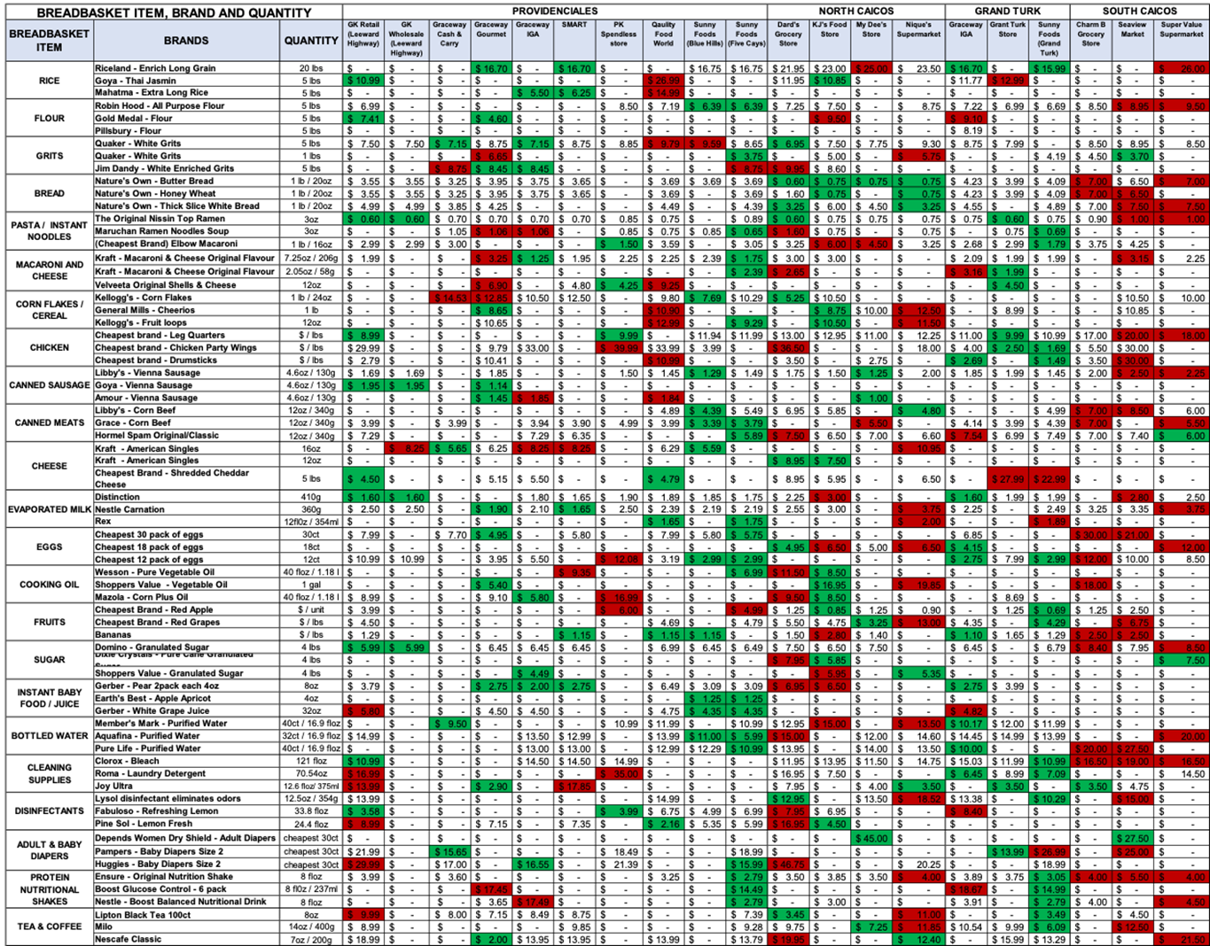 Green cells represent the two (2) lowest prices for the breadbasket item and associated brand.